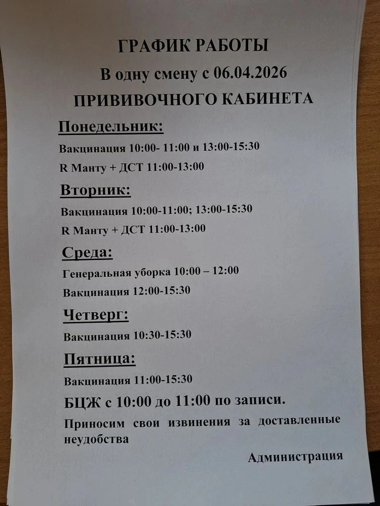 График работы прививочного кабинета в одну смену с 06.04.2026