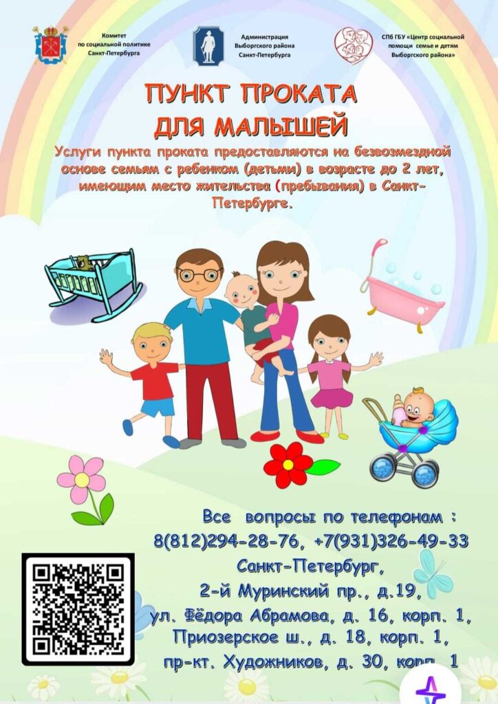 1. В Выборгском районе работает Пункт проката предметов первой необходимости для новорожденных на базе Центра социальной помощи семье и детям Выборгского района по адресам: 2-й Муринский пр., д. 19; ул. Художников, д. 30, к. 1; пр. Пархоменко, д. 18; Лесной пр., д. 20, к. 6; ул. Федора Абрамова, д. 16, к. 1; Приозерское шоссе, д. 18, к. 1.